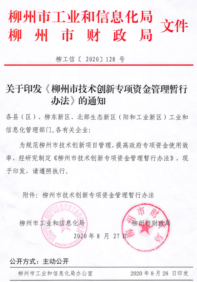 轉(zhuǎn)發(fā):關(guān)于印發(fā)《柳州市技術(shù)創(chuàng)新專(zhuān)項(xiàng)資金管理暫行辦法》的通知(2020-10-10)