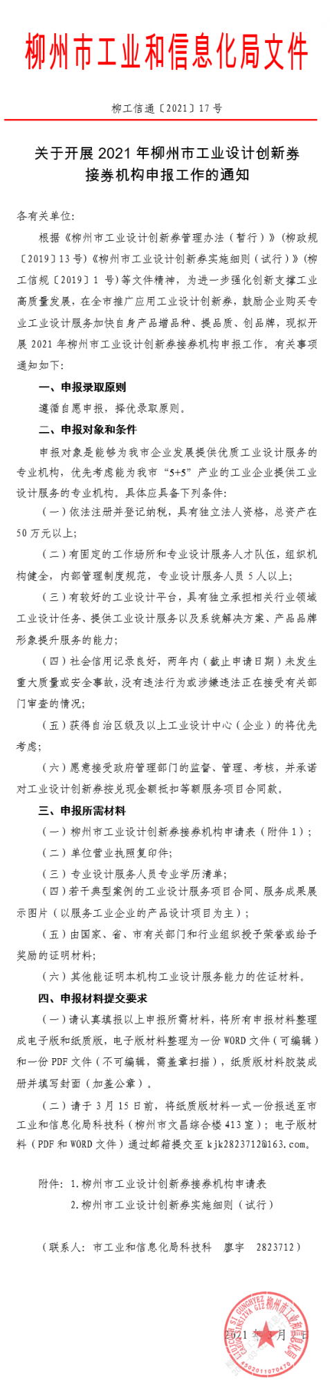 關于開展2021年柳州市工業(yè)設計創(chuàng)新券接券機構申報工作的通知(2021-03-02)