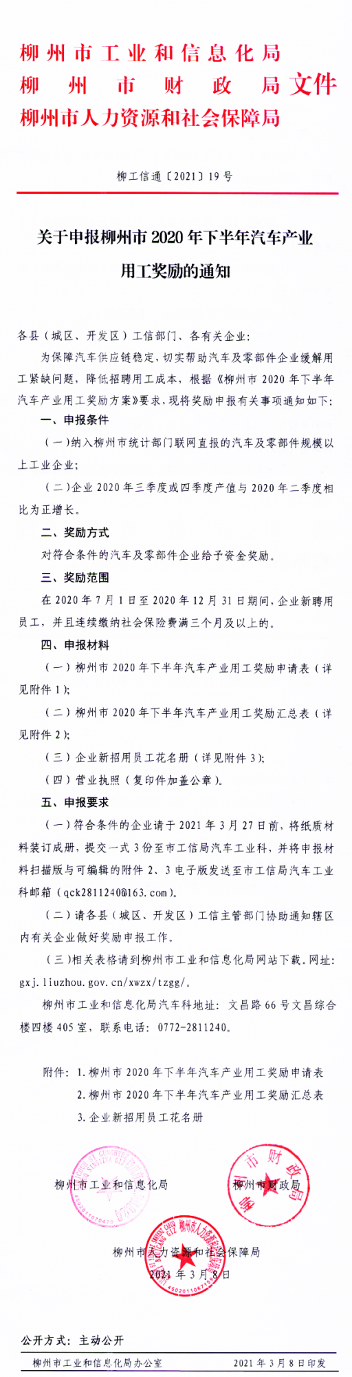 關(guān)于申報柳州市2020年下半年汽車產(chǎn)業(yè)用工獎勵的通知(2021年3月9號)