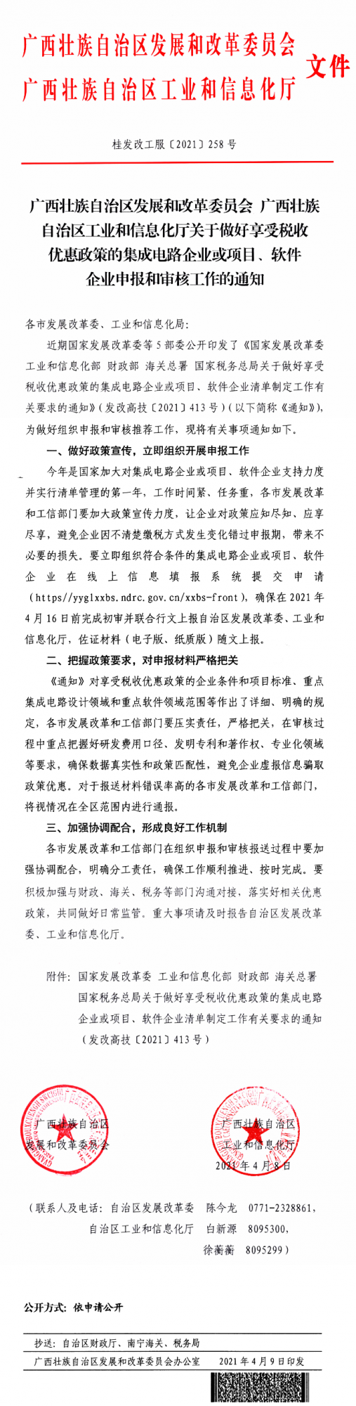 廣西壯族自治區(qū)發(fā)展和改革委員會、廣西壯族自治區(qū)工業(yè)和信息化廳關于做好享受稅收優(yōu)惠政策的集成電路企業(yè)或項目、軟件企業(yè)申報和審核工作的通知(2021-04-13)