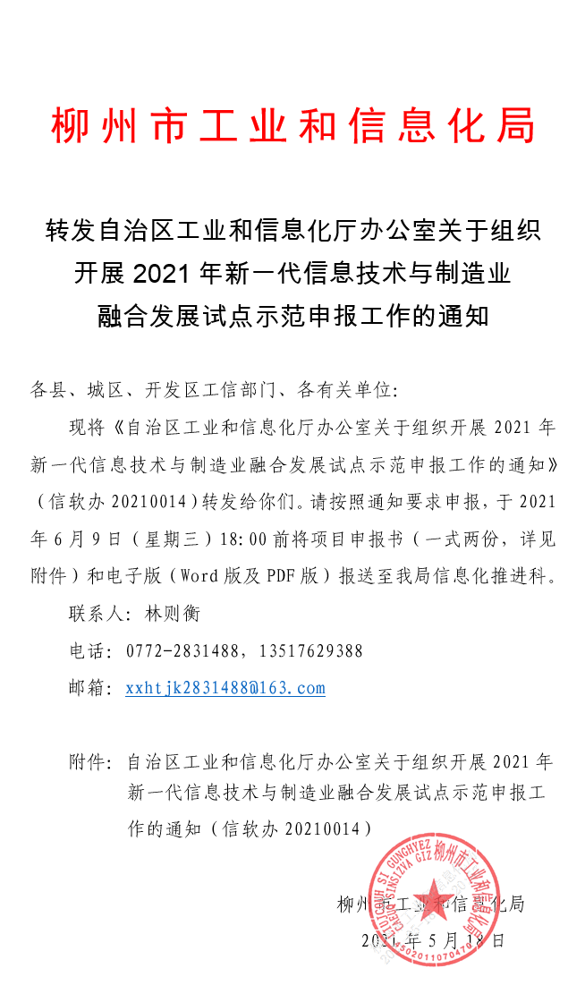 轉(zhuǎn)發(fā)自治區(qū)工業(yè)和信息化廳辦公室關(guān)于組織開展2021年新一代信息技術(shù)與制造業(yè)融合發(fā)展試點示范申報工作的通知(2021年5月18日)